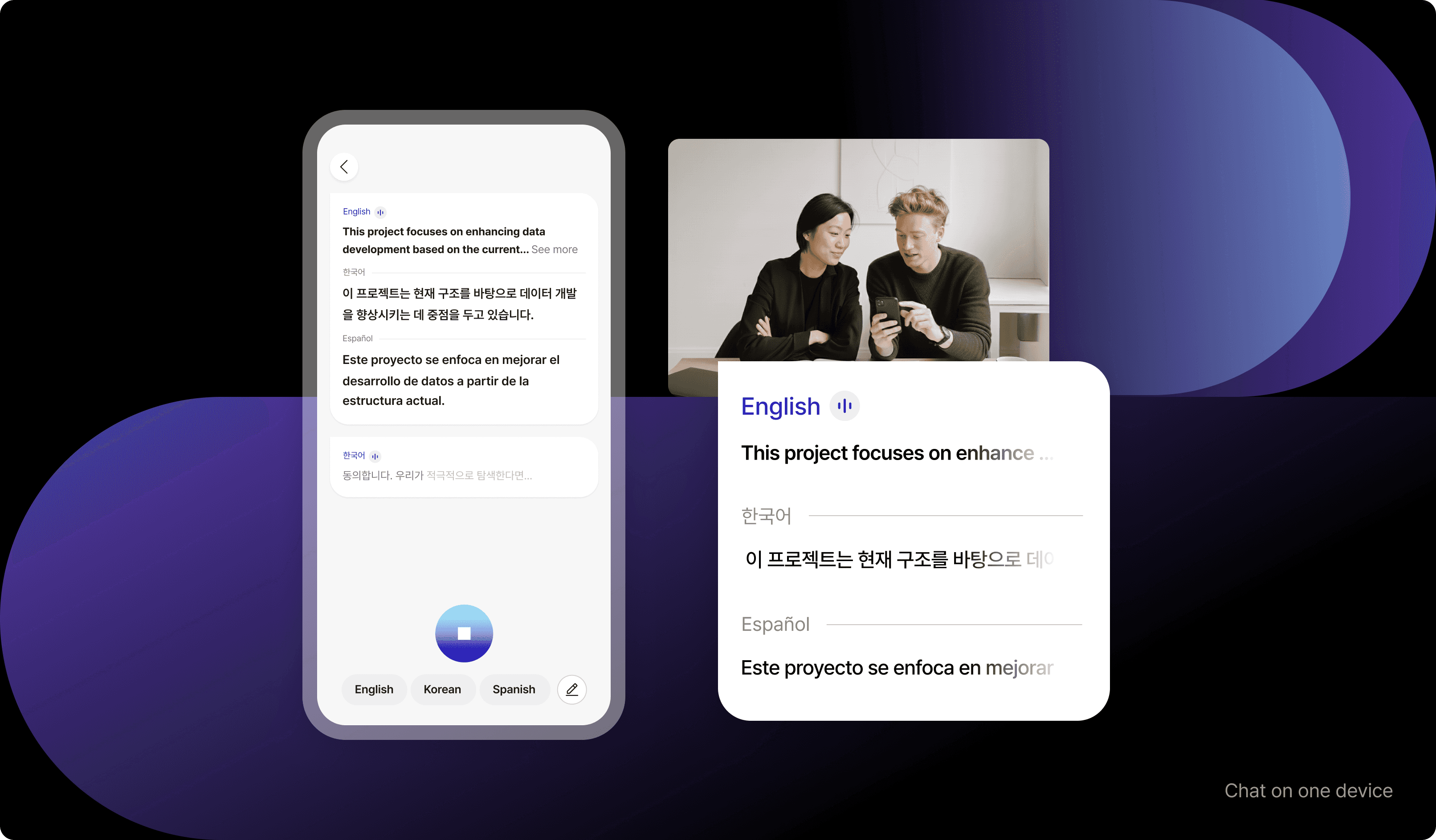Chat Translation enables seamless real time communication across language barriers on a single device. Powered by Flitto’s automatic language recognition technology, it instantly detects and translates up to three languages with speed and accuracy wherever global communication is required.