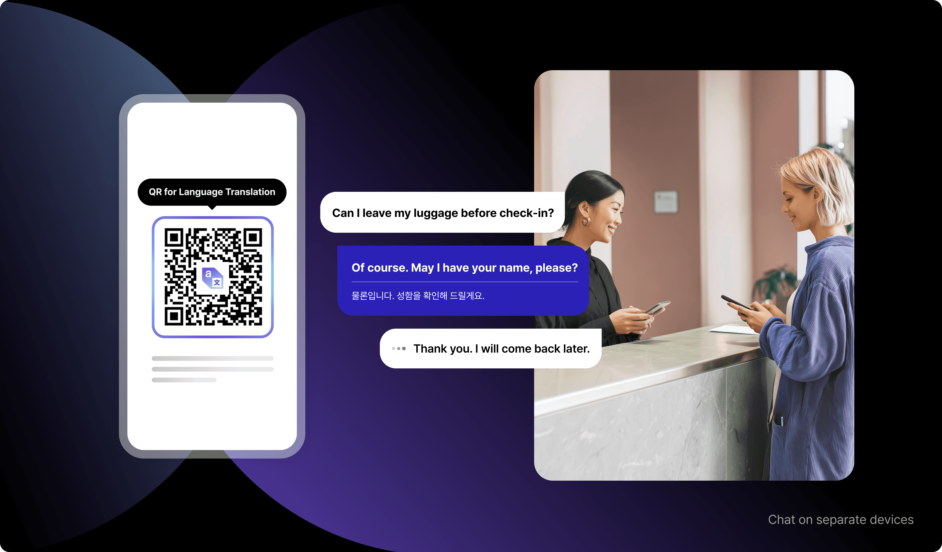 Speak confidently in your native language with no more copying and pasting from translation tools. Simply scan the QR code to instantly join a chat room, and just speak to communicate with remote multilingual users as quickly and comfortably as you would with a regular messenger.